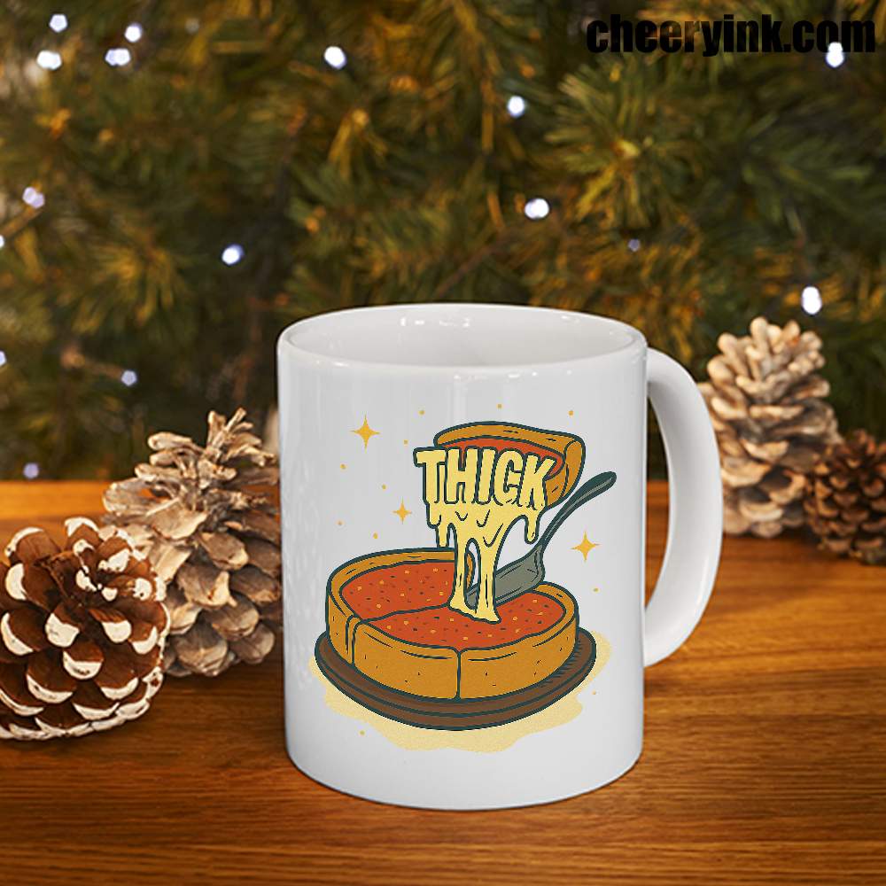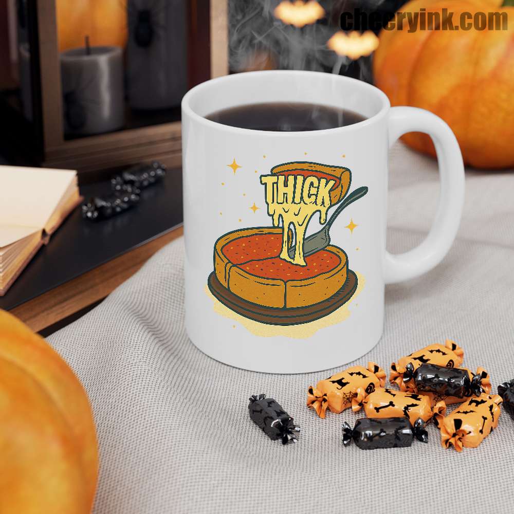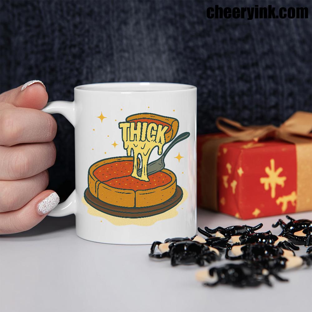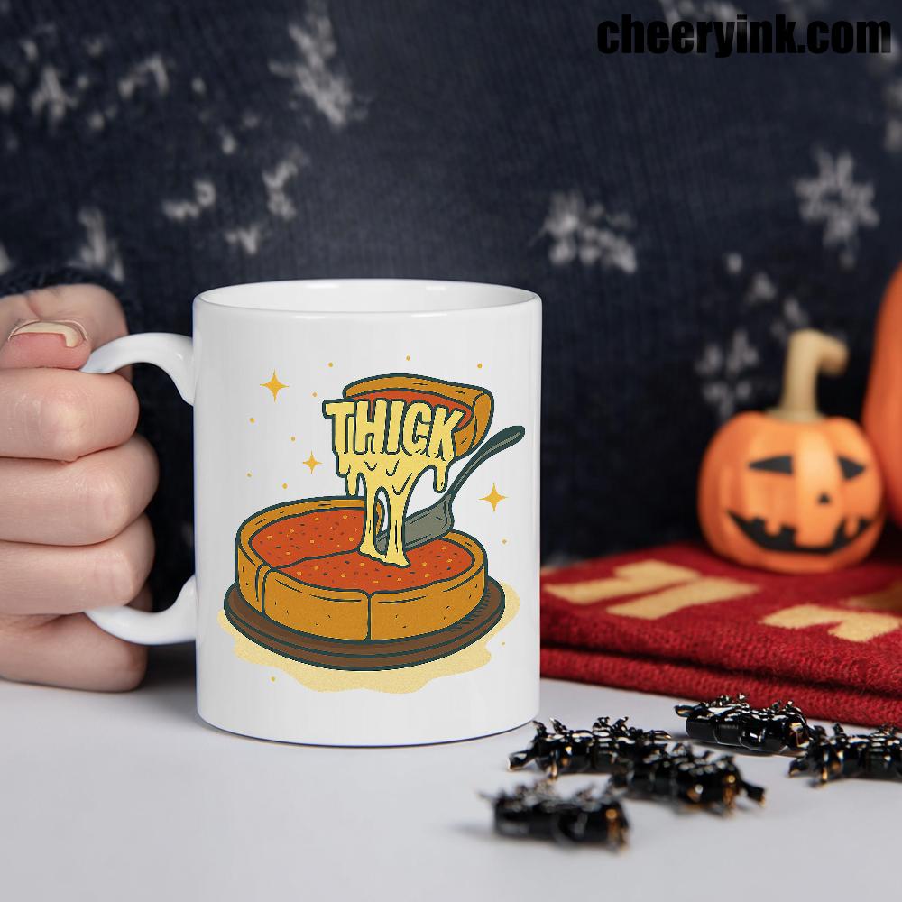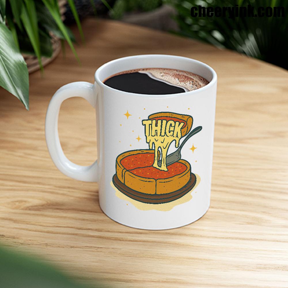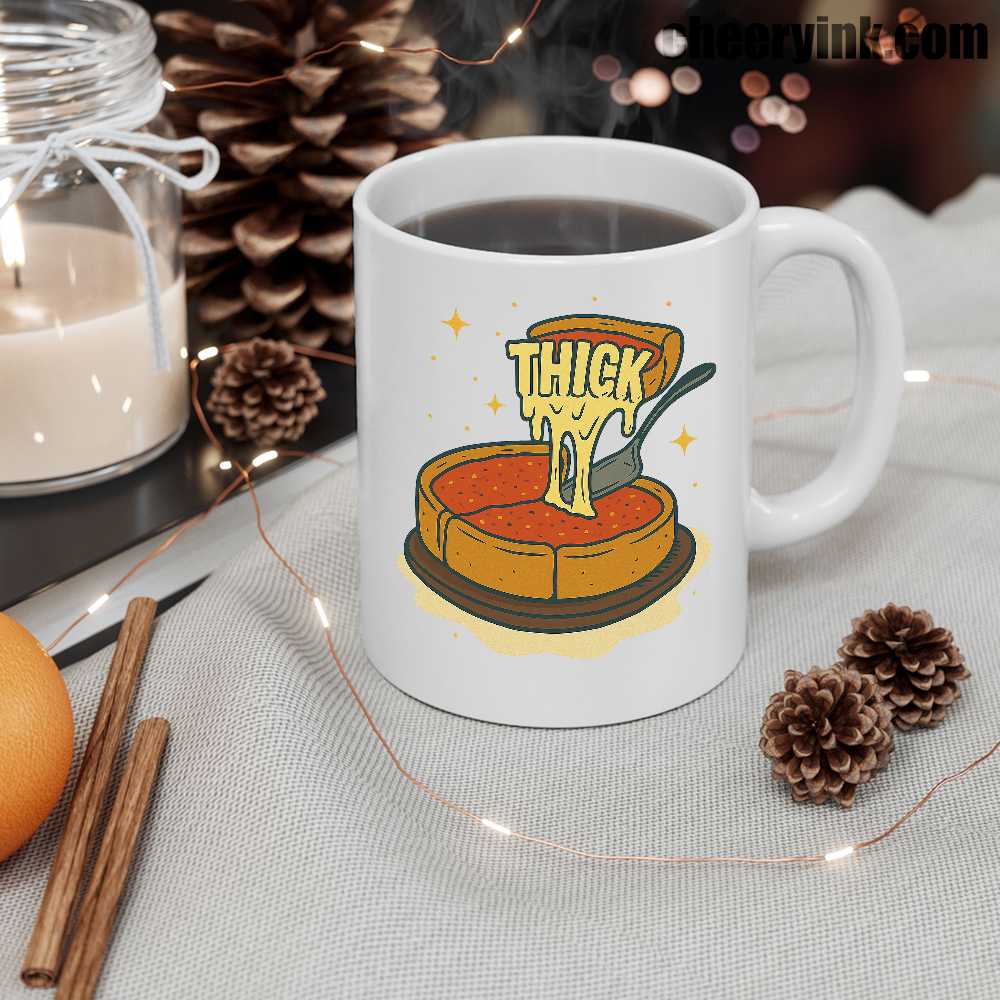 Spice up your mornings with the Thick Deep Dish Pizza Mug featuring gooey cheese and bold “THICK” graphics.
