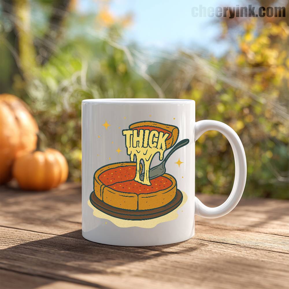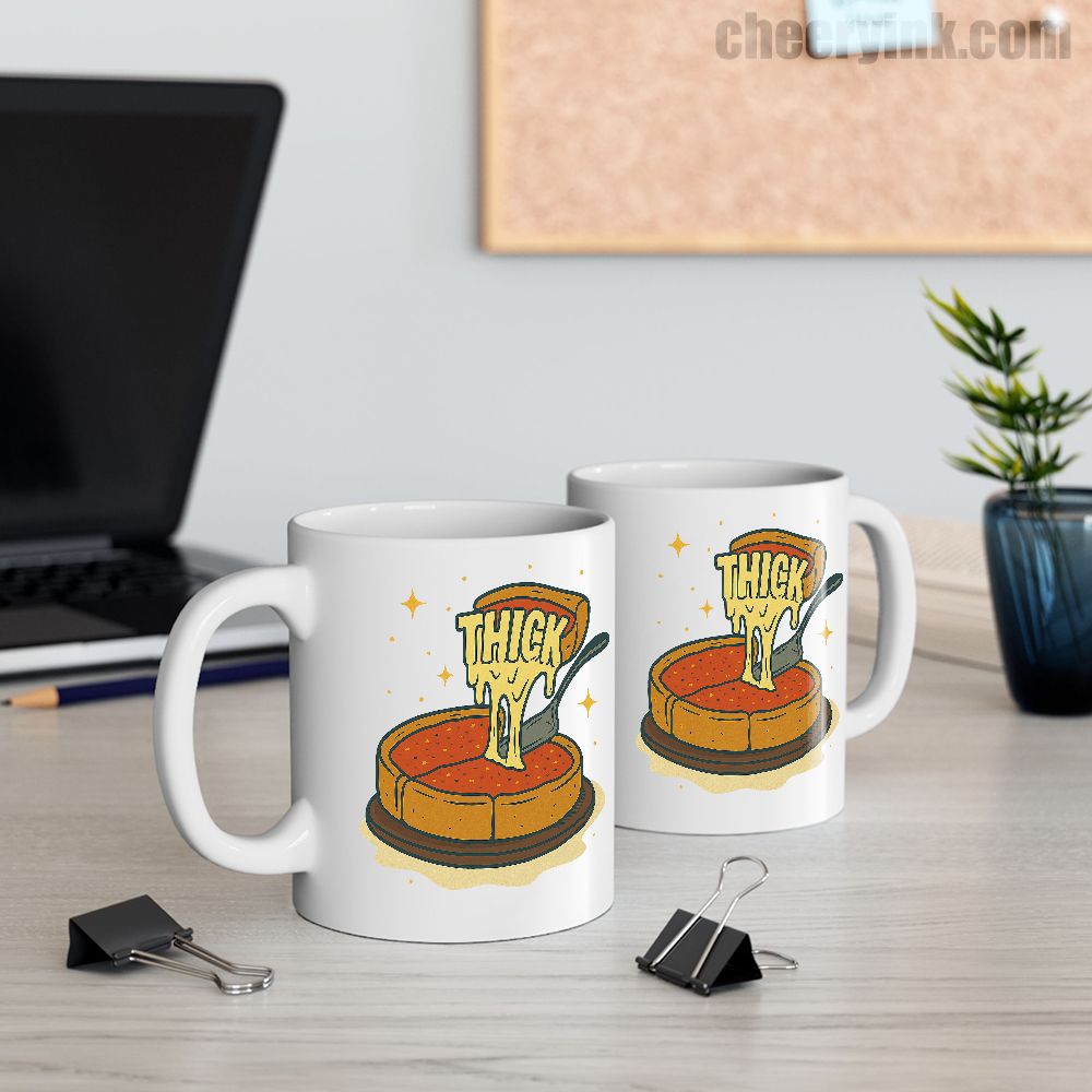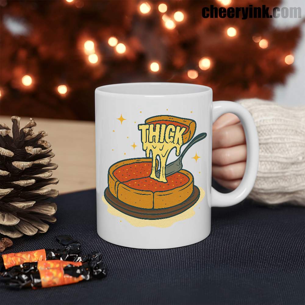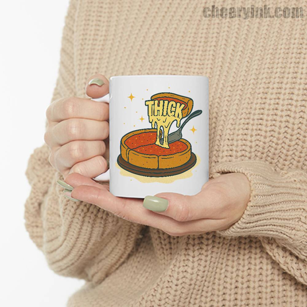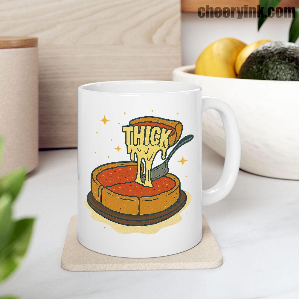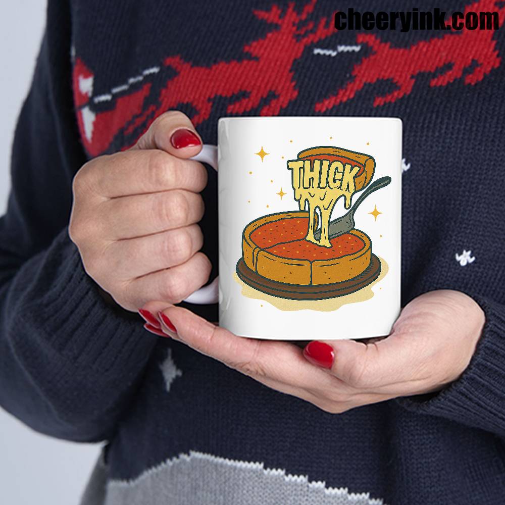 Spice up your mornings with the Thick Deep Dish Pizza Mug featuring gooey cheese and bold “THICK” graphics.