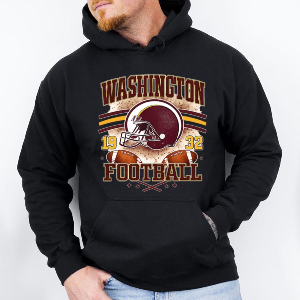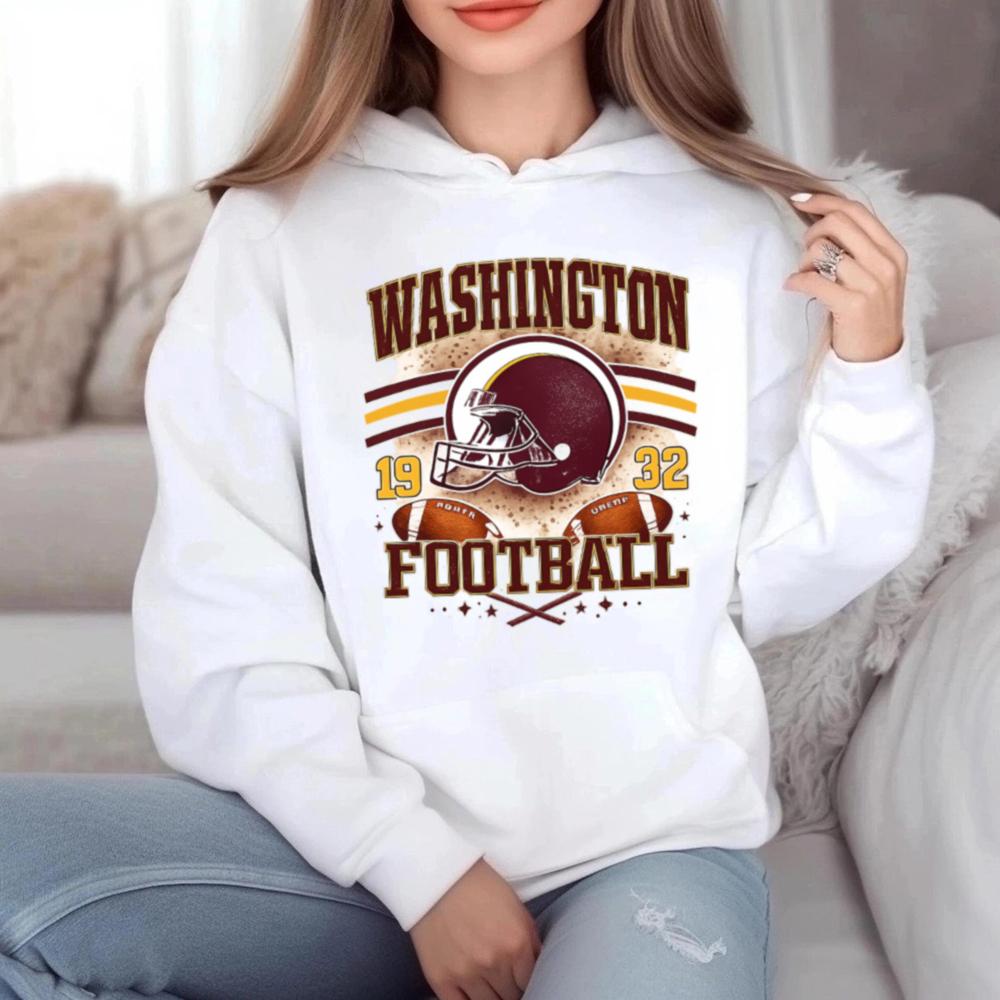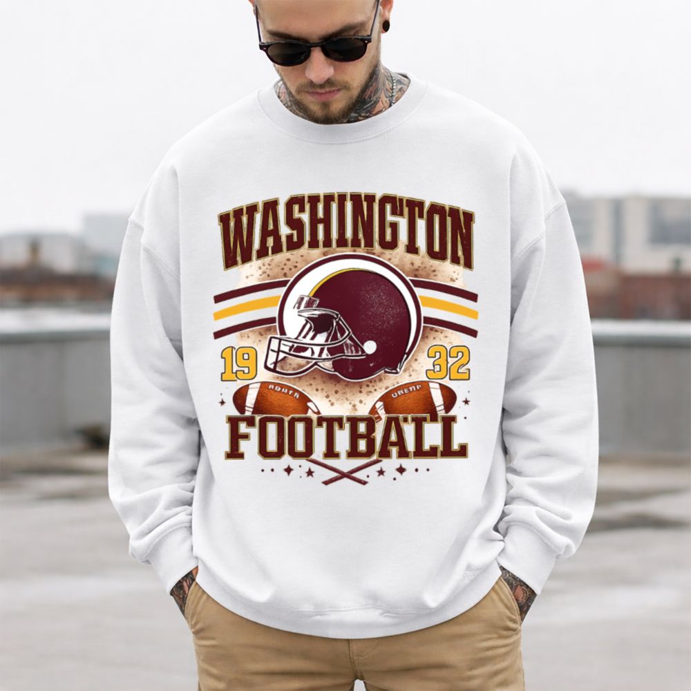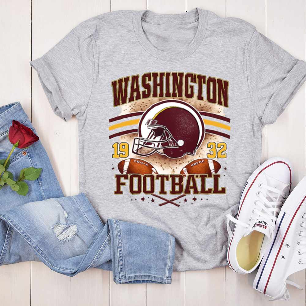 Show your old-school football pride with the Washington Football Est 1932 T-Shirt. Designed for true fans of the burgundy and gold, this vintage-inspired graphic tee highlights the year the team was established with a distressed look that screams classic grit. The bold “WASHINGTON” arch, helmet centerpiece, and crossed footballs round out a nostalgic design built for stadium style or casual streetwear.