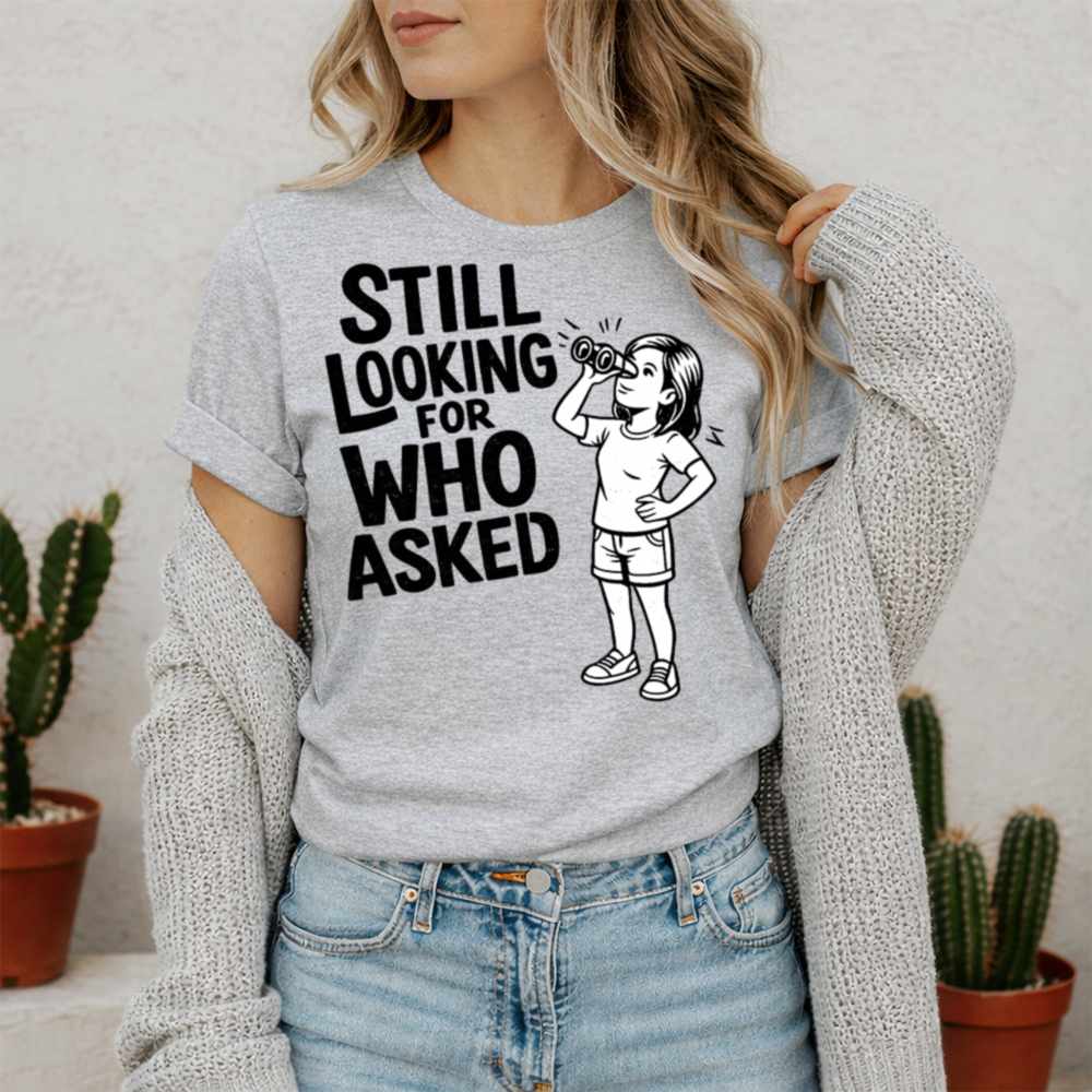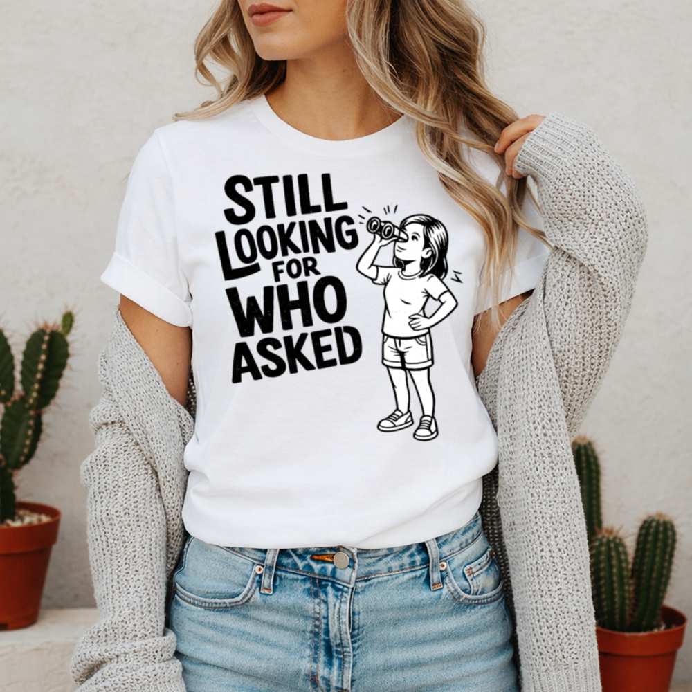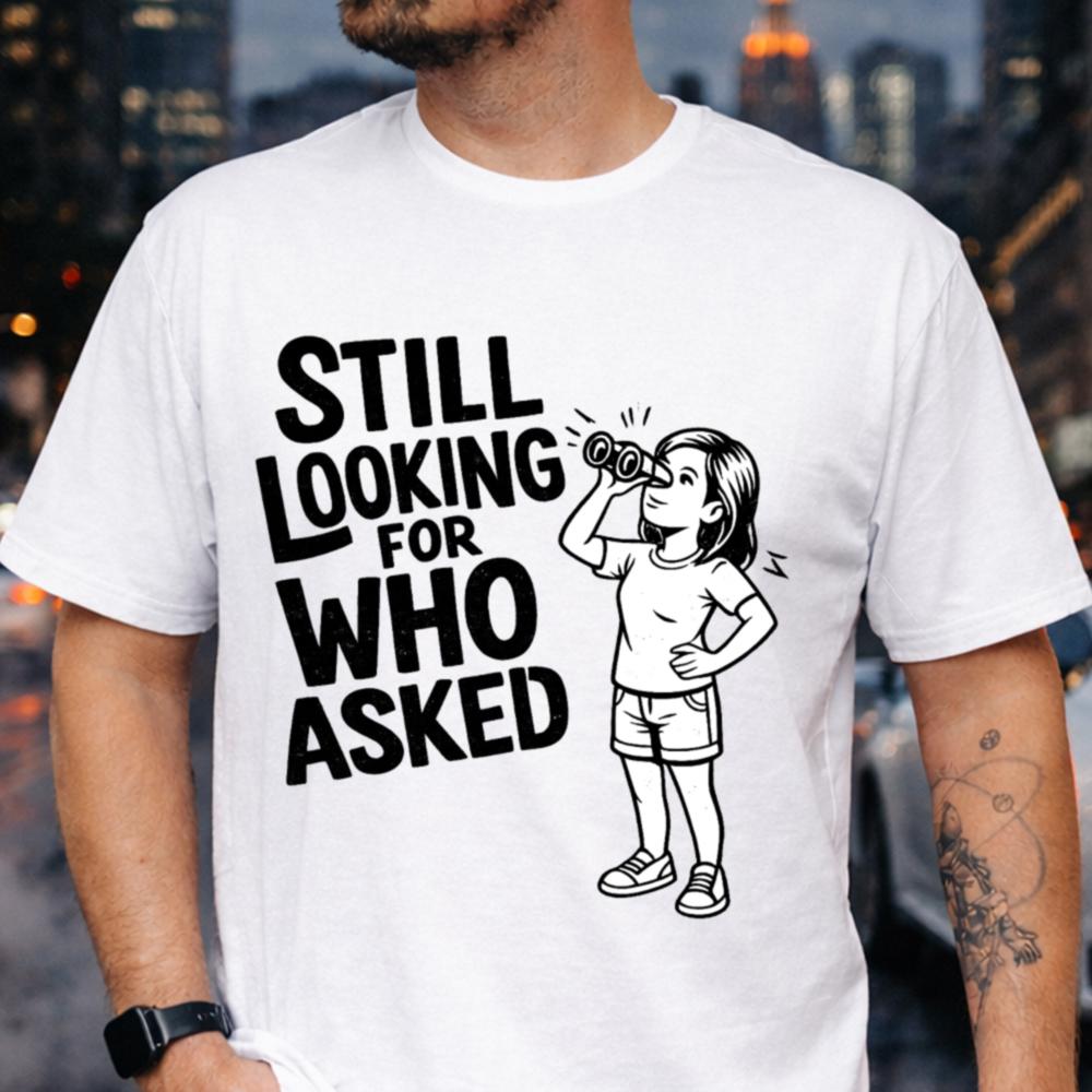 Introducing the Who Asked T-Shirt, a perfect blend of humor and style for those who appreciate a touch of dark comedy. This design captures a playful yet sarcastic message, showcasing a character looking through binoculars, humorously questioning who truly cares about the opinions of others. Ideal for adults with a witty sense of humor, this T-Shirt serves as a conversation starter and a statement piece. Wear it to casual outings, gatherings with friends, or simply while lounging at home. It’s an excellent choice for those who enjoy expressing their personality through unique and humorous apparel.