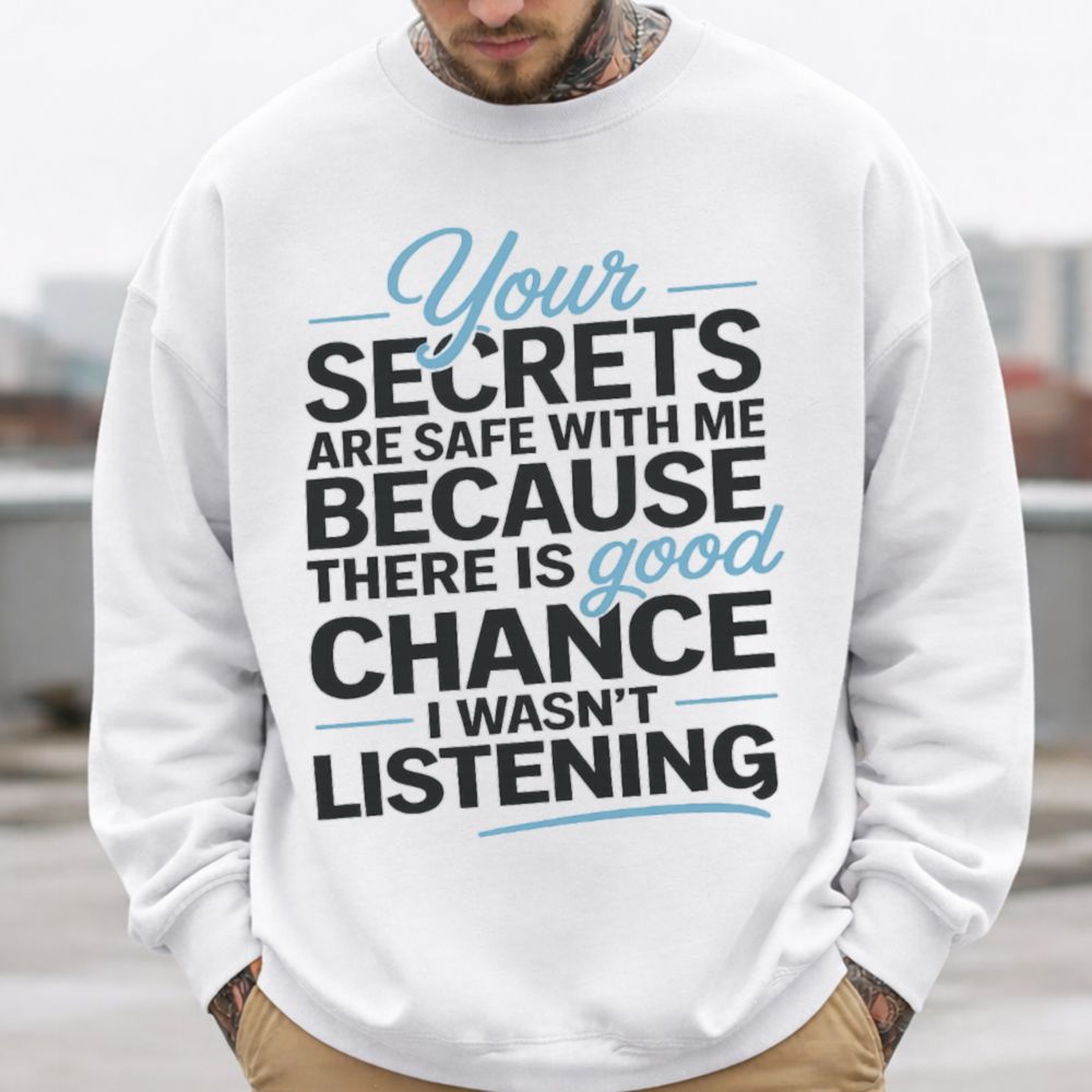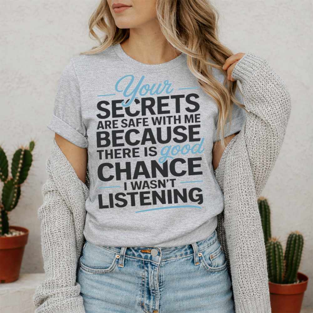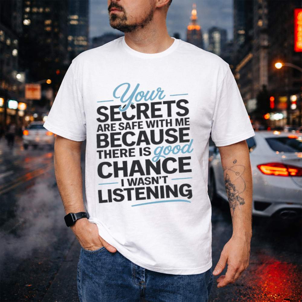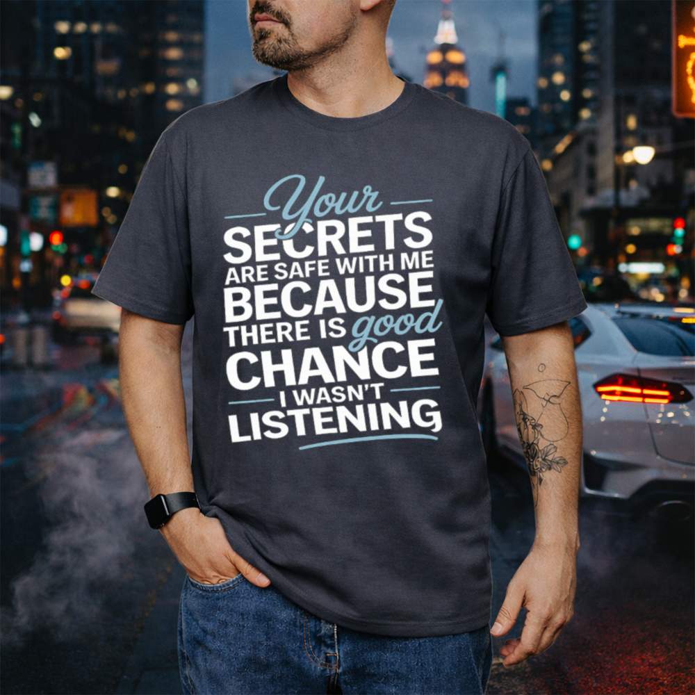 The Your Secrets Are Safe With Me T-Shirt is a hilarious way to admit your selective hearing skills. Featuring the quote “Your secrets are safe with me because there is a good chance I wasn’t listening,” this unisex tee is perfect for anyone known to zone out mid-conversation. Soft, comfy, and sarcastic to the core, it’s your next go-to laugh-out-loud outfit. Ideal for social butterflies with short attention spans or introverts who proudly don’t care.